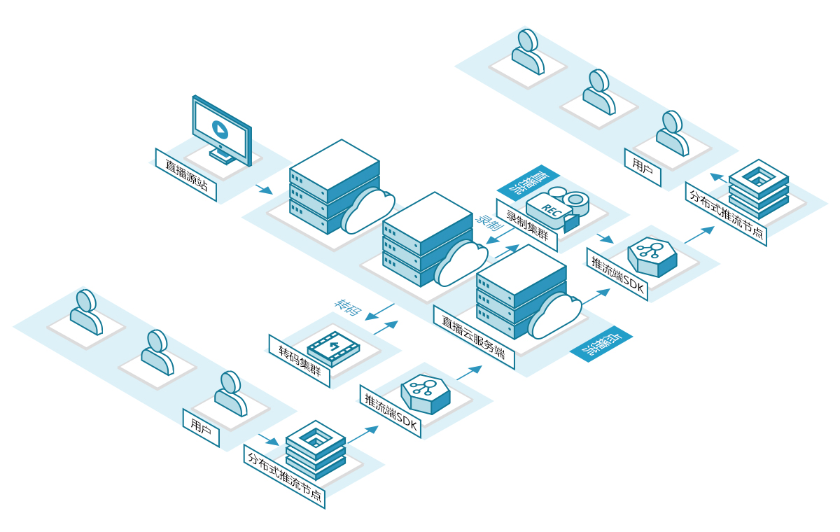 直播云的对象存储服务BOS能提供海量的文件存储服务,同时具有11个9的数据可靠性,并提供同城热备和异地灾备方案,使海量视频永久存储,随时可得。分层分发保证直播流的传输质量,最大程度减少传输环节对直播效果的影响